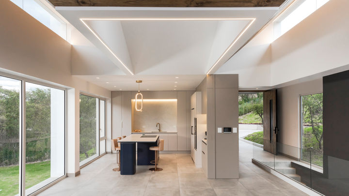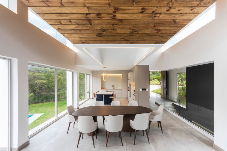 La propuesta se desarrolla en un lenguaje moderno, con énfasis en la amplitud, la ventilación cruzada y la eficiencia térmica. El gesto arquitectónico más relevante es una cubierta invertida, pensada no solo como elemento expresivo, sino como respuesta funcional al clima de la zona. Esta decisión, que rompe con la lógica tradicional de techos, supuso también un ejercicio técnico en la gestión de aguas, integrando diseño e ingeniería en una solución coherente.